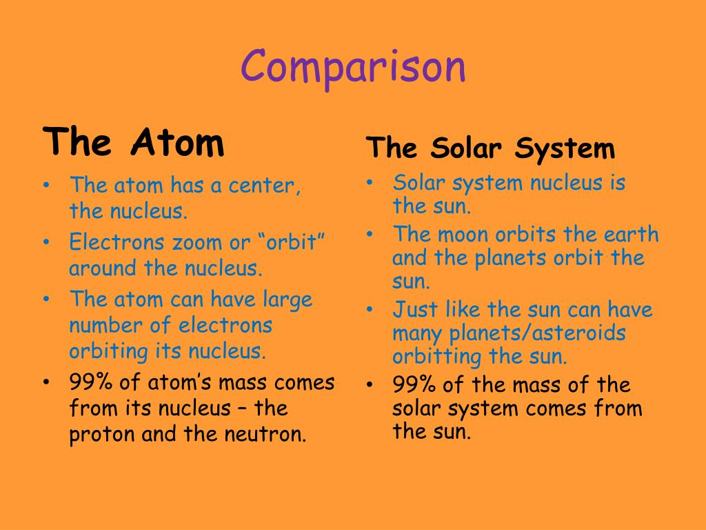 First, an atom is about an angstrom in size, the solar system is a bit larger... First, an atom is about an angstrom in size, the solar system is a bit larger. Vacuum tubes (called valves in britain) make use of this principle... Apr 22, 2012 · in an atom electrons orbit a central nucleus, while in the solar system the planets orbit the sun.